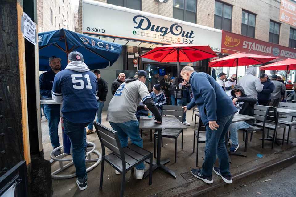 Fans hangout outside of Dugout, a local Yankees bar, before the home opener baseball game between the New York Yankees and Miami Marlins at Yankee Stadium in Bronx, NY, Friday, April 3, 2026.