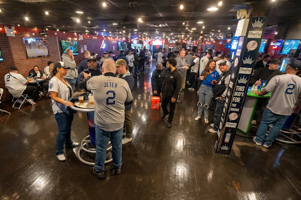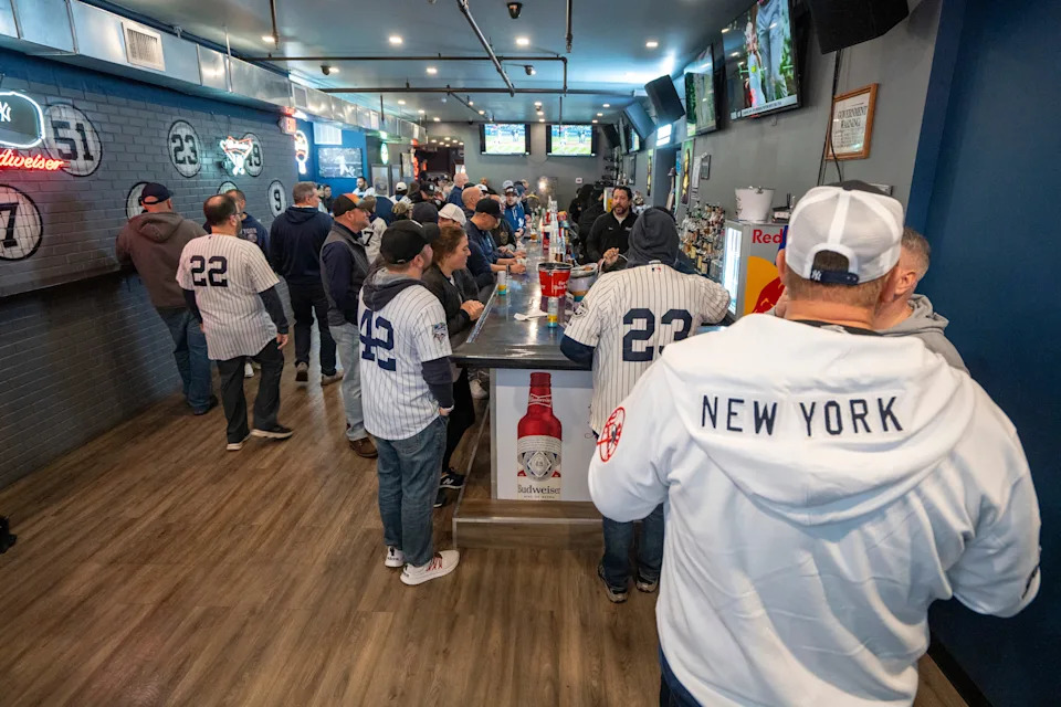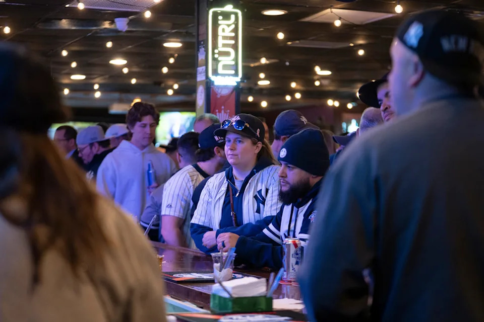 Fans order drinks at Dugout, a local Yankees bar, before the home opener baseball game between the New York Yankees and Miami Marlins at Yankee Stadium in Bronx, NY, Friday, April 3, 2026.