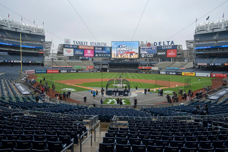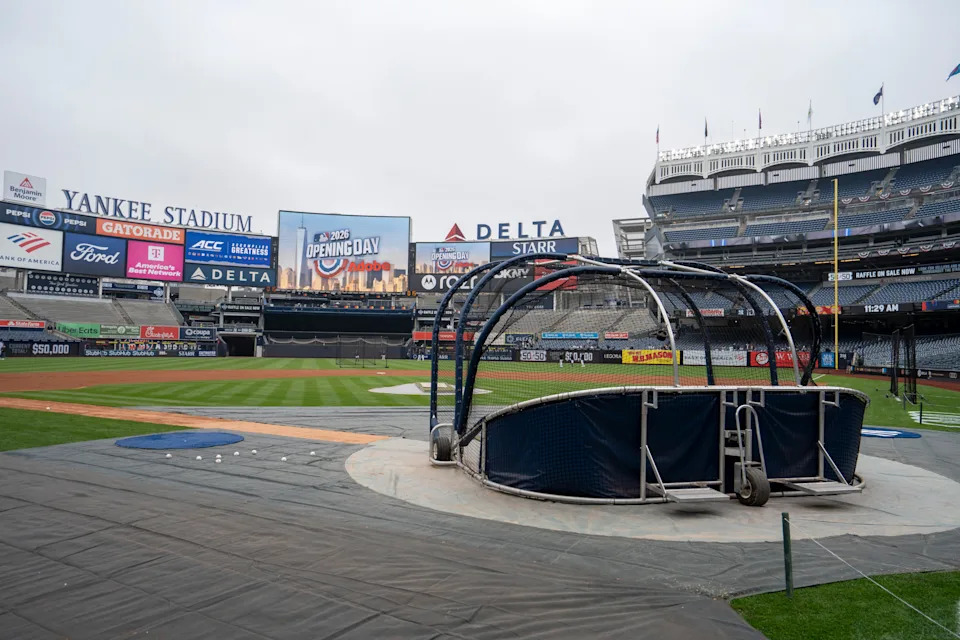 Players begin to take batting practice before the home opener baseball game between the New York Yankees and Miami Marlins at Yankee Stadium in Bronx, NY, Friday, April 3, 2026.