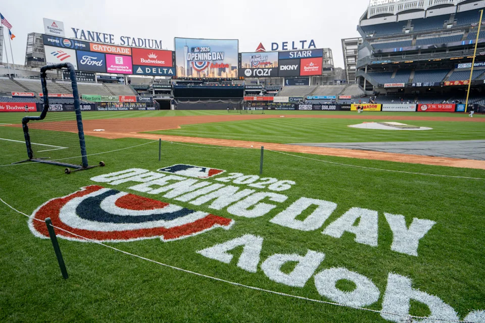 An opening day logo is painted on the field before the home opener baseball game between the New York Yankees and Miami Marlins at Yankee Stadium in Bronx, NY, Friday, April 3, 2026.