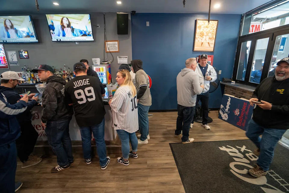 Fans hang out at Dugout, a local Yankees bar, before the home opener baseball game between the New York Yankees and Miami Marlins at Yankee Stadium in Bronx, NY, Friday, April 3, 2026.