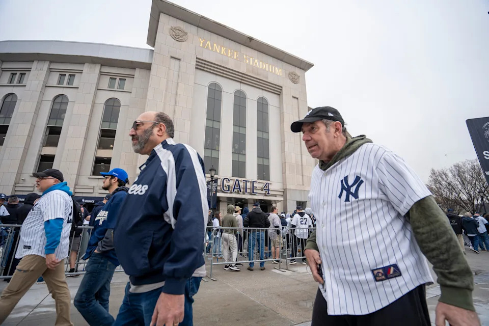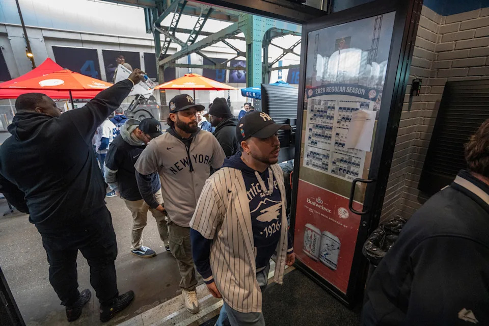 Fans wait in line to enter the home opener baseball game between the New York Yankees and Miami Marlins at Yankee Stadium in Bronx, NY, Friday, April 3, 2026.