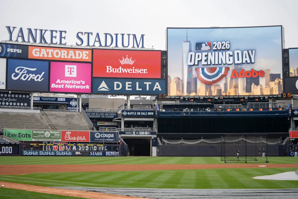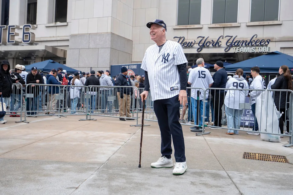A fan waits for his group before the home opener baseball game between the New York Yankees and Miami Marlins at Yankee Stadium in Bronx, NY, Friday, April 3, 2026.