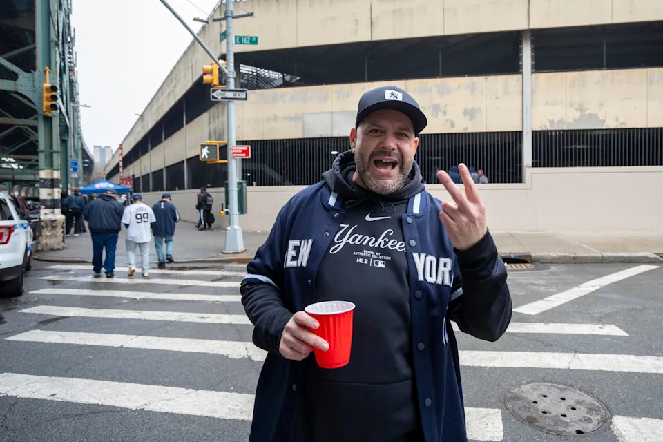 A fan shouts while heading towards the stadium before the home opener baseball game between the New York Yankees and Miami Marlins at Yankee Stadium in Bronx, NY, Friday, April 3, 2026.