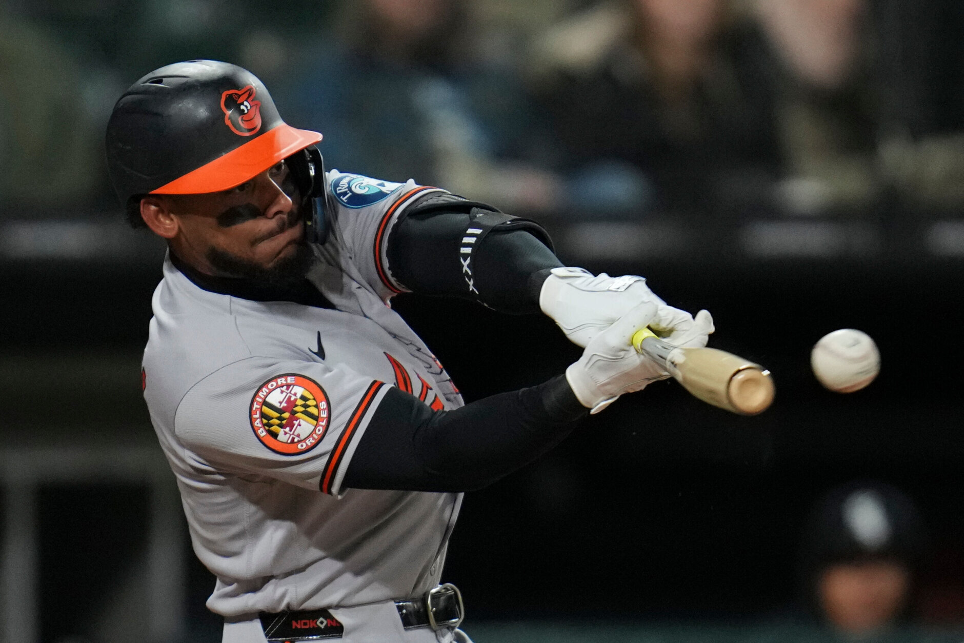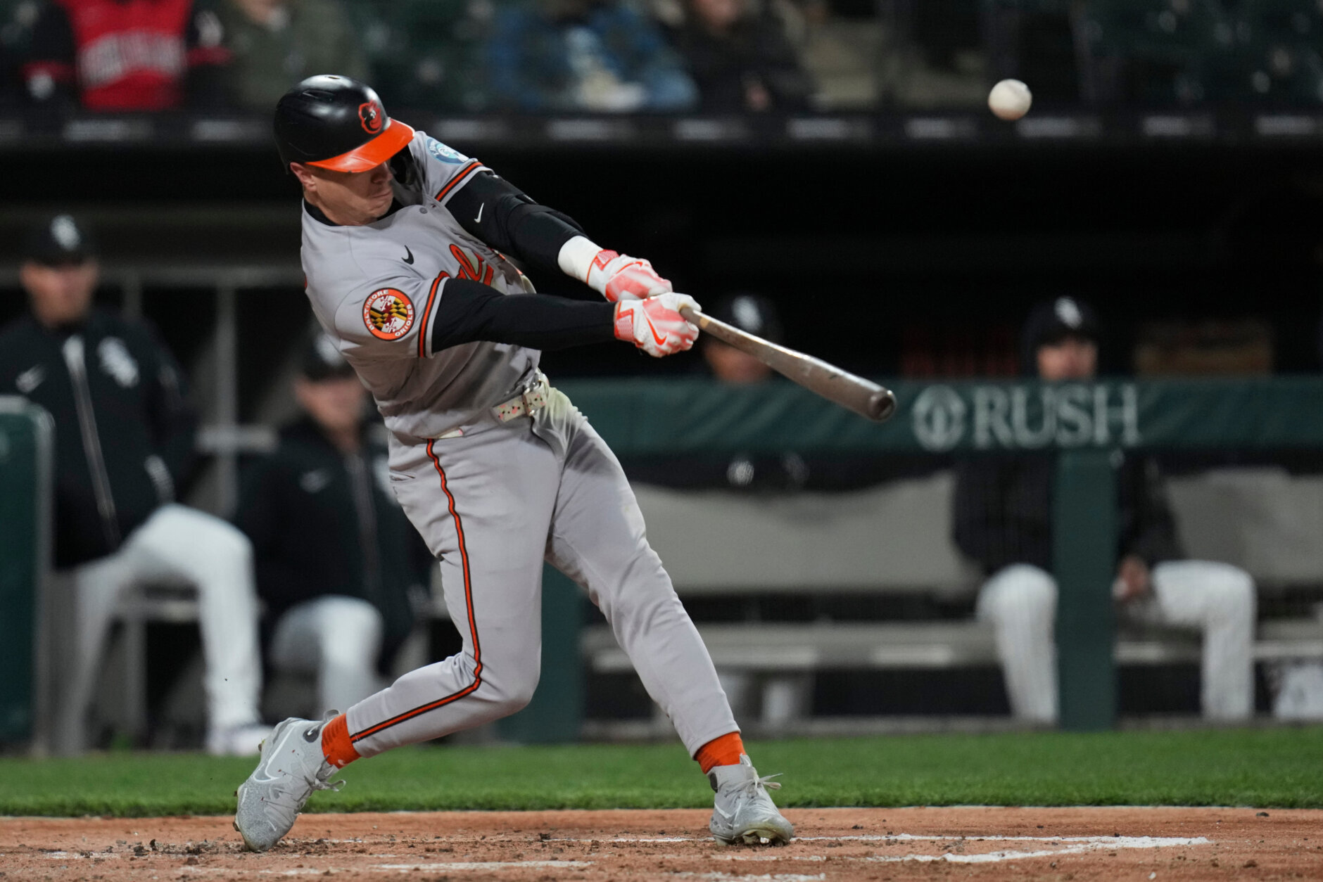 Orioles White Sox Baseball Baltimore Orioles’ Jeremiah Jackson hits a single during the eighth inning of a baseball game against the Chicago White Sox, Monday, April 6, 2026, in Chicago. (AP Photo/Erin Hooley)