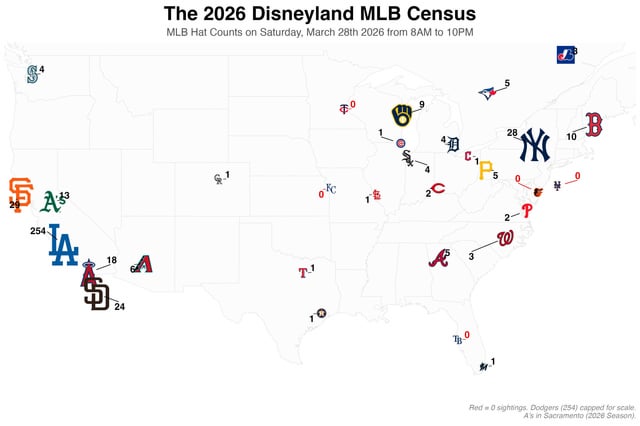 [Reddit] I spent 14 hours at Disneyland on March 28th and counted every single MLB hat I saw from 8 AM to 10 PM – The Angels were not well represented considering that Disneyland is in Orange County. Lots of Brewers fans, relatively speaking. I saw 25/30 teams represented on 3/28. By 3/31 I had seen 29/30. The only team I never saw a hat for was The Rays. I even saw three Expos hats, but no Rays hats. Unsurprisingly there were a ton of Dodgers hats.