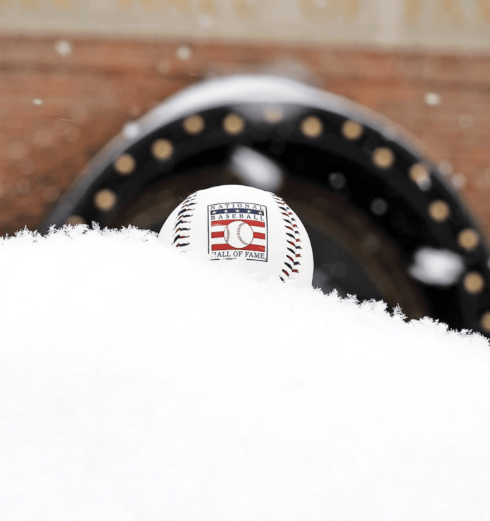 A baseball rests atop a pile of snow at the Baseball Hall of Fame in Cooperstown, N.Y. Giancarlo Stanton is the active player with the most home runs, at 454. Photo courtesy of @baseballhall on Instagram