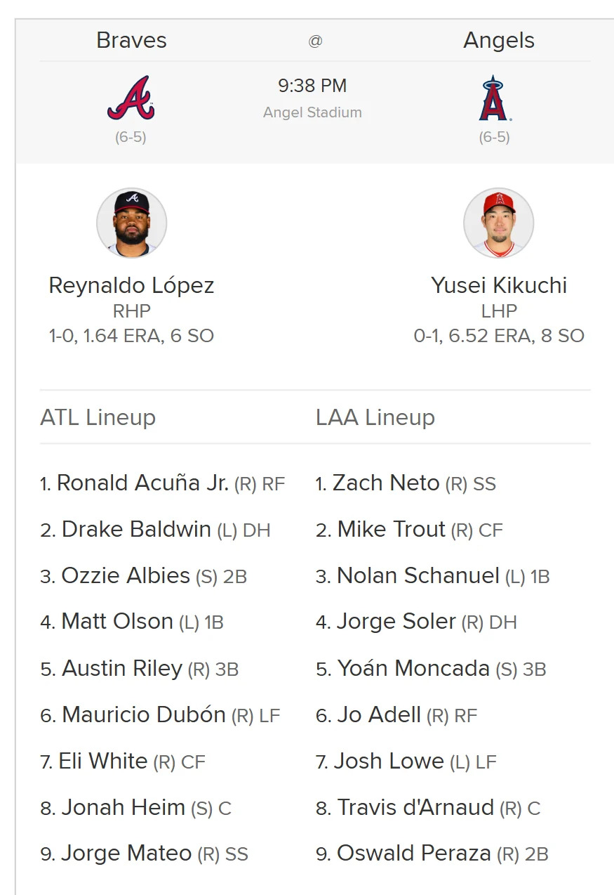 Nolan Schanuel will be present to take over first base, and Travis d’Arnaud, who’s only been accounted for in two games this season so far, is also set to make his return as catcher, batting eighth in the lineup.