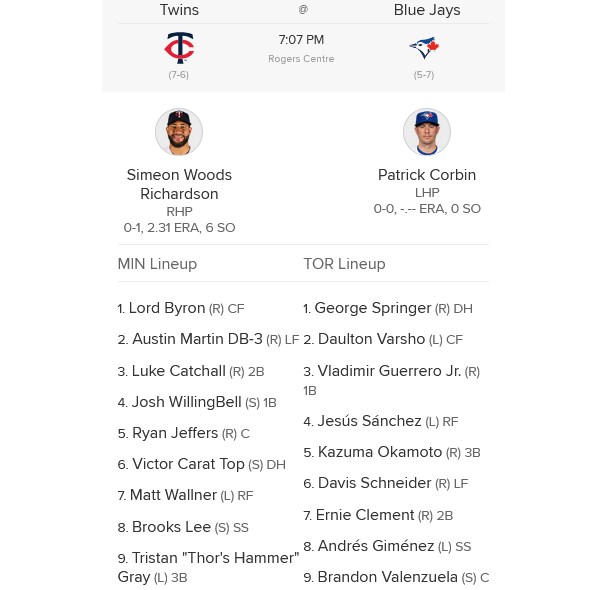 Talk about a bummer ending for Blue Jays fans in last year’s World Series; losing a late lead in Game 7, then losing the game in extra innings (the same happened in Game 3). In the offseason, the Jays picked up Dylan Cease, Taylor Rogers’s brother, and today’s starter, Patrick Corbin. Corbin’s a low-90s junkballer who’s a fan of politicians that cheat at golf, plus he’s lefthanded and breathing, which means he’ll probably give Twins hitters fits. (Or, maybe not, if Zach’s got this squad measured correctly.)