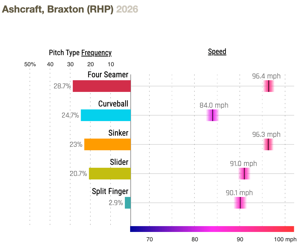 Braxton Ashcraft did pretty well in his rookie season last year — 2.71 ERA, 1.249 WHIP in 26 appearances (eight starts). This year he’s going to be a full-time member of the Pirates rotation and he has made two pretty good starts to date, completing six innings in both. In his last outing, April 5 vs. the Orioles, he struck out eight.