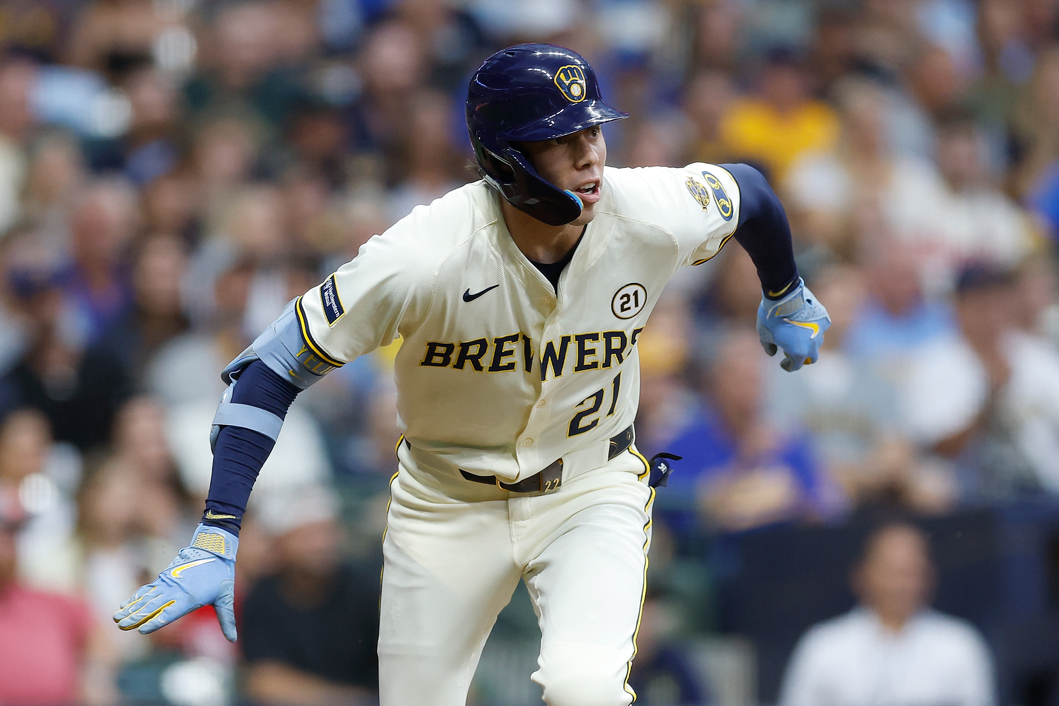 GettyChristian Yelich #22 of the Milwaukee Brewers hits an RBI double in the first inning against the Los Angeles Angels at American Family Field on September 16, 2025 in Milwaukee, Wisconsin. Some players are wearing #21 for Roberto Clemente Day.
