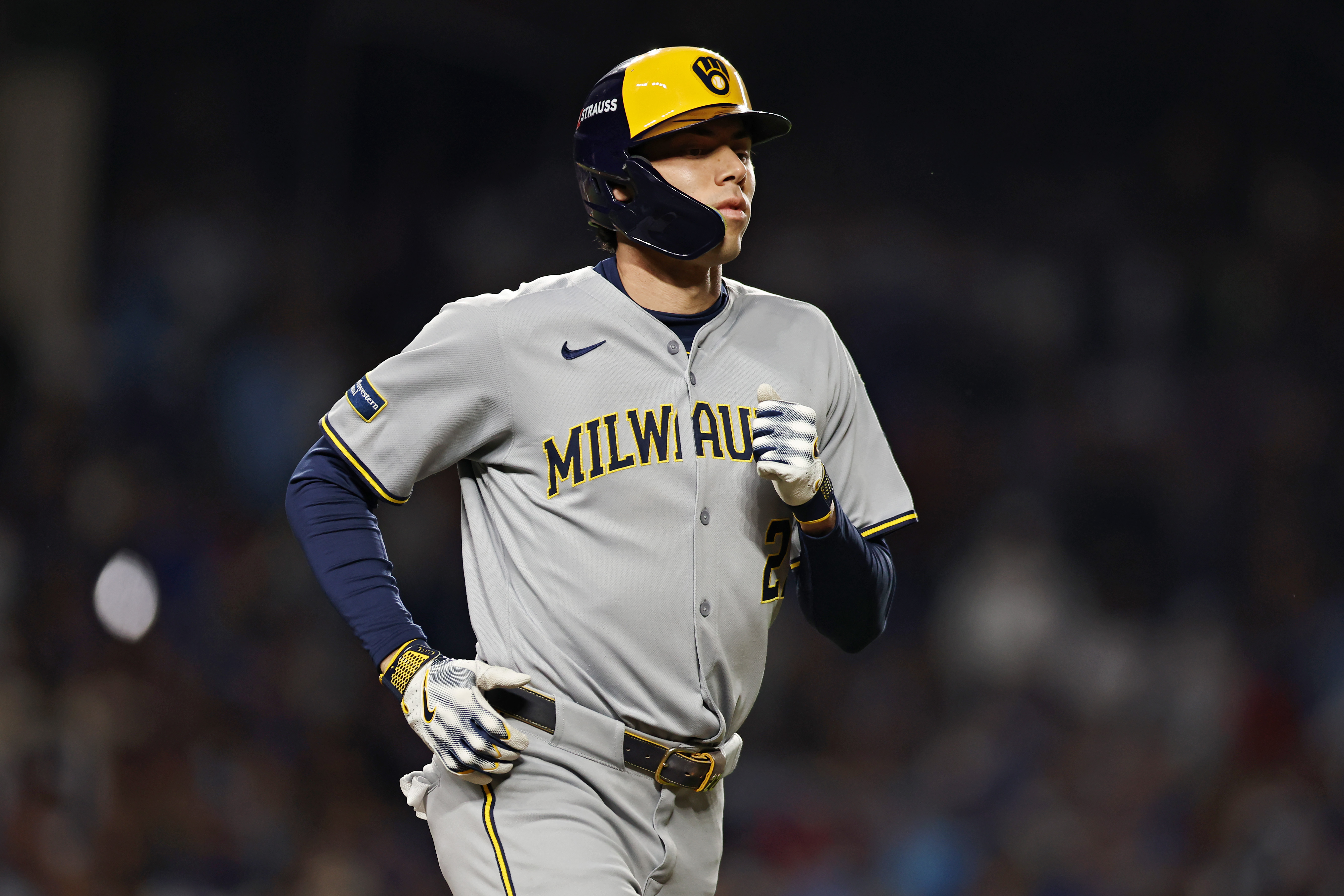 GettyChristian Yelich #22 of the Milwaukee Brewers jogs to first base after drawing walk during the first inning against the Chicago Cubs in game four of the National League Division Series at Wrigley Field on October 09, 2025 in Chicago, Illinois.