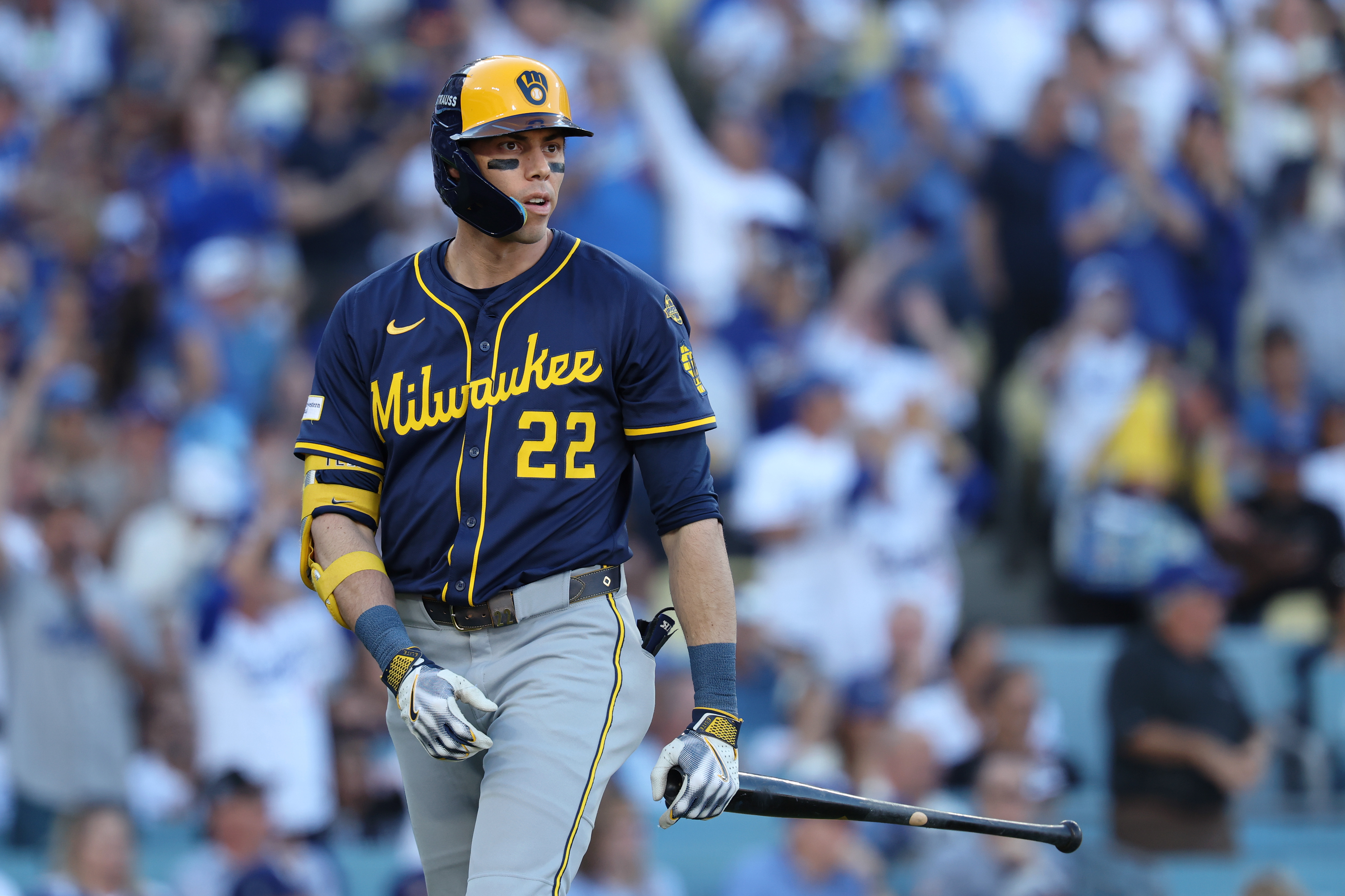 GettyChristian Yelich #22 of the Milwaukee Brewers strikes out against the Los Angeles Dodgers to end the third inning in game three of the National League Championship Series at Dodger Stadium on October 16, 2025 in Los Angeles, California.