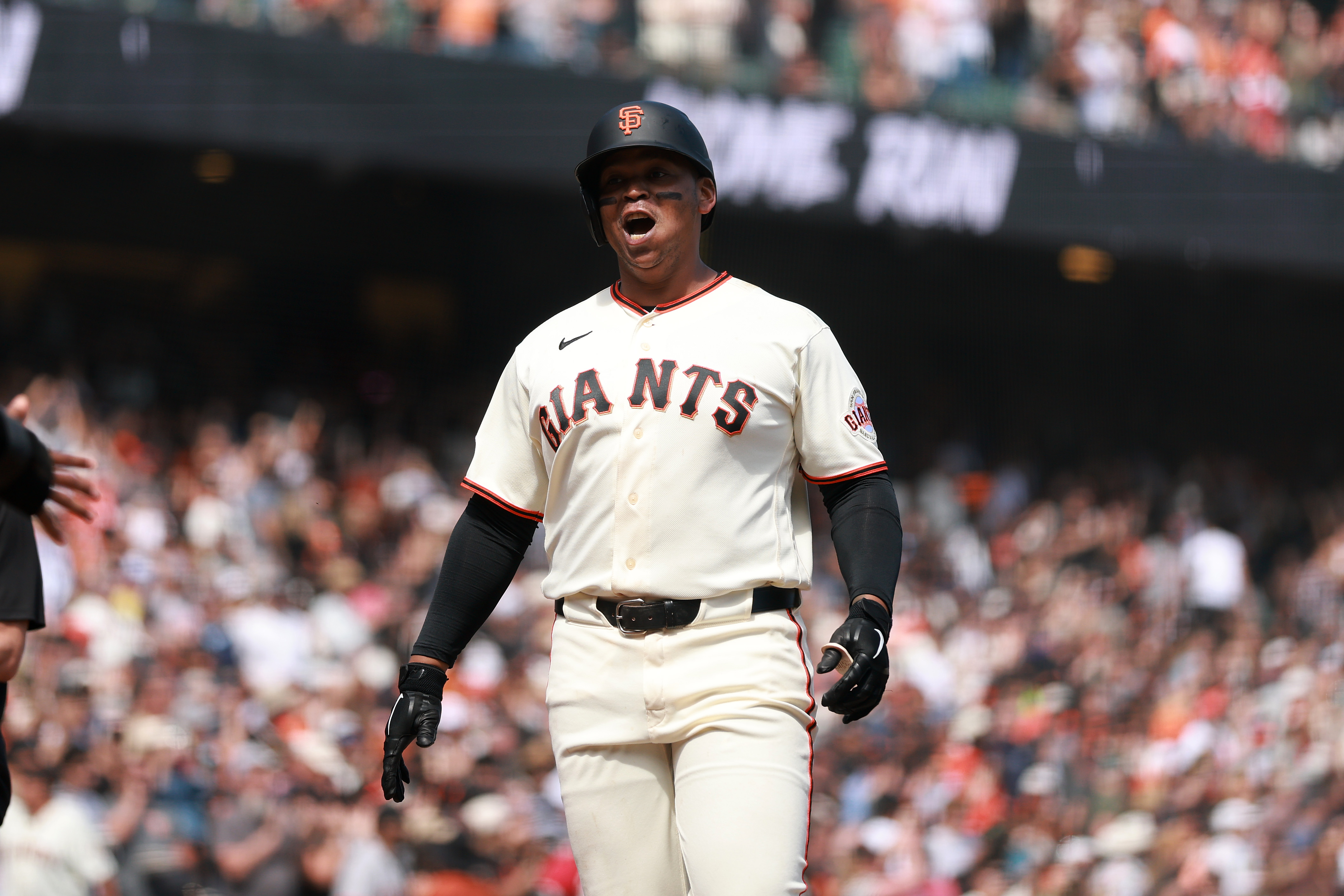 GettyRafael Devers #16 of the San Francisco Giants reacts after he scored against the Los Angeles Dodgers in the bottom of the first inning at Oracle Park on September 13, 2025 in San Francisco, California.