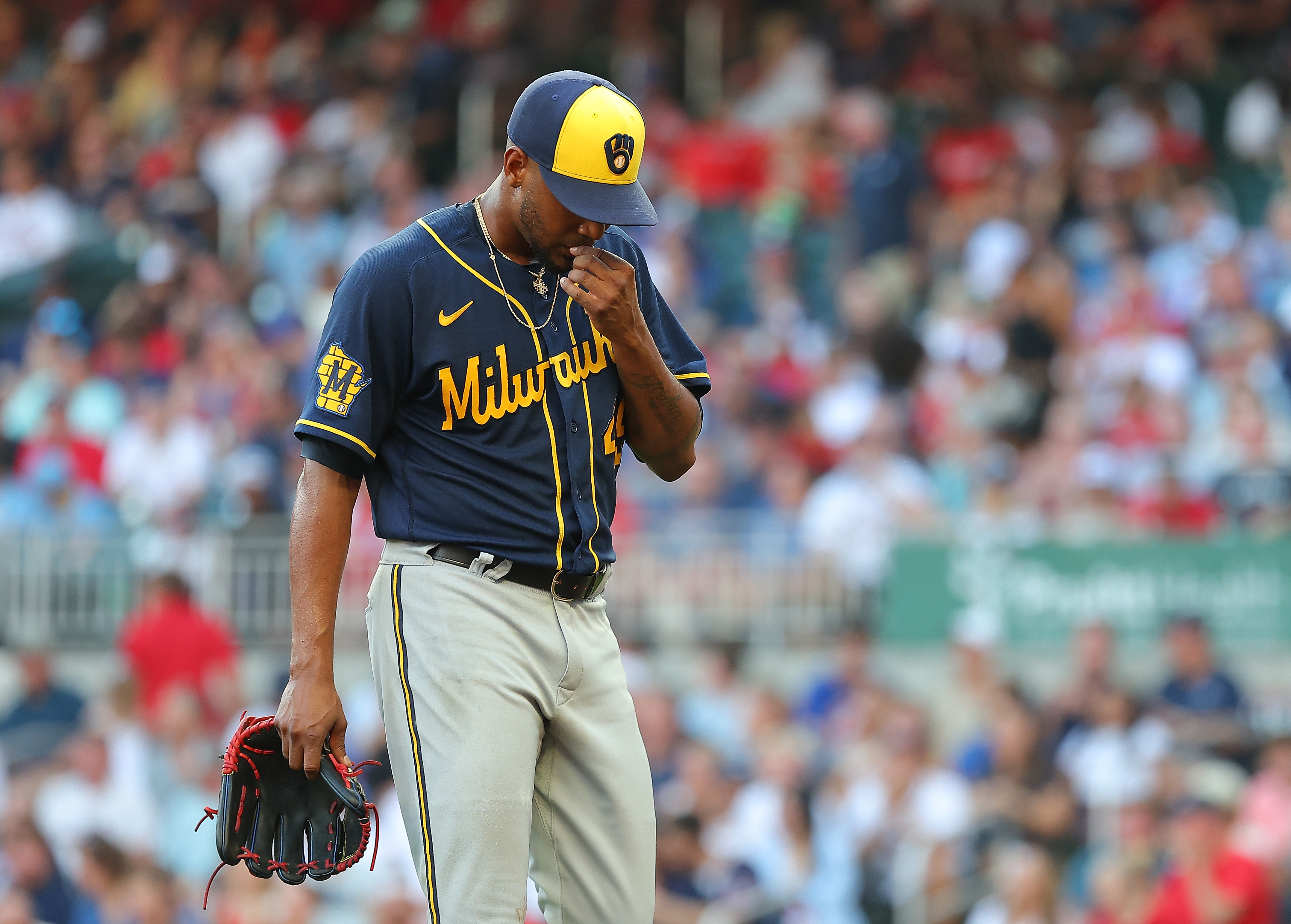 GettyJulio Teheran #49 of the Milwaukee Brewers reacts as he walks off the first after giving up six runs in the first inning to the Atlanta Braves at Truist Park on July 29, 2023 in Atlanta, Georgia.