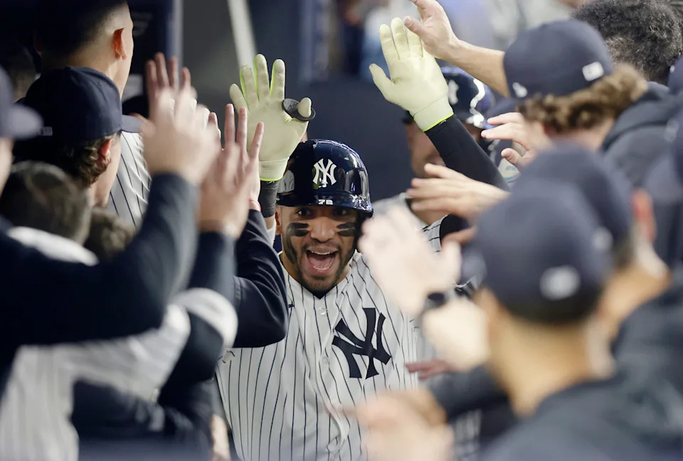 NEW YORK, NEW YORK – APRIL 13: Jose Caballero #72 of the New York Yankees celebrates in the dugout his two-run home run in the second inning against the Los Angeles Angels at Yankee Stadium on April 13, 2026 in New York City. (Photo by Jim McIsaac/Getty Images)