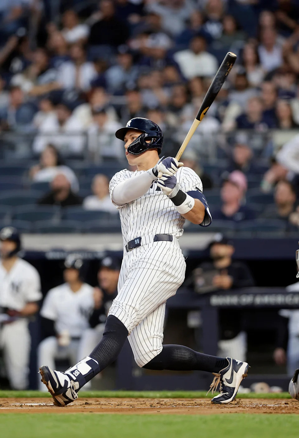 NEW YORK, NEW YORK – APRIL 13: Aaron Judge #99 of the New York Yankees hits a solo home run in the sixth inning against the Los Angeles Angels at Yankee Stadium on April 13, 2026 in New York City. (Photo by Jim McIsaac/Getty Images)