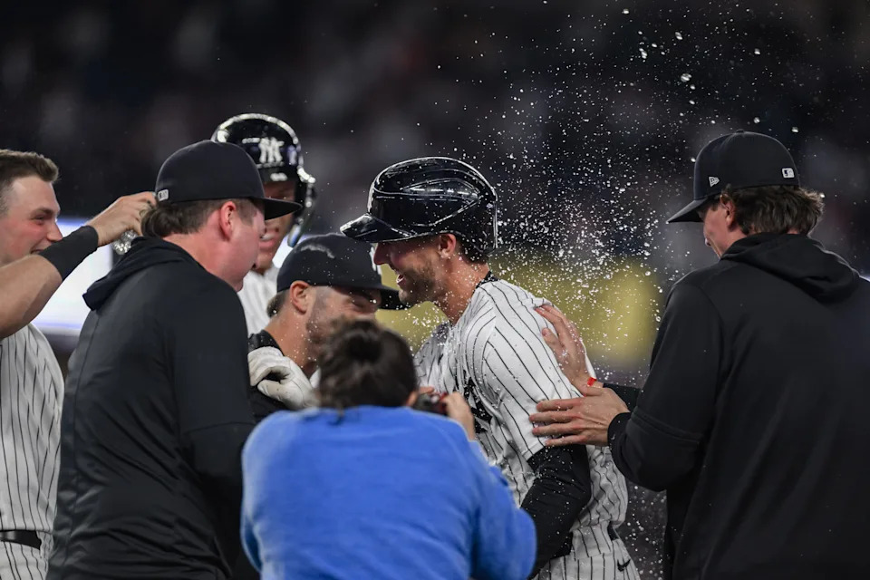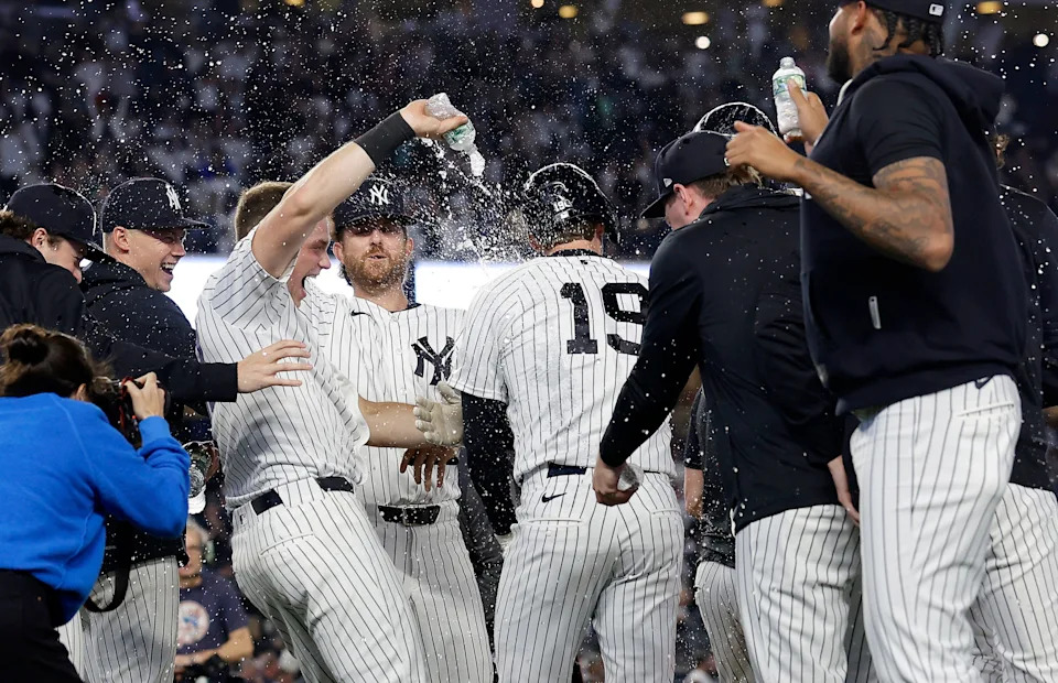 NEW YORK, NEW YORK – APRIL 13: Ryan McMahon #19 of the New York Yankees celebrates with teammates after being at the plate when a wild pitch pitch was thrown, allowing the winning run from third base score in the ninth inning for an 11-10 win against the Los Angeles Angels at Yankee Stadium on April 13, 2026 in New York City. (Photo by Jim McIsaac/Getty Images)