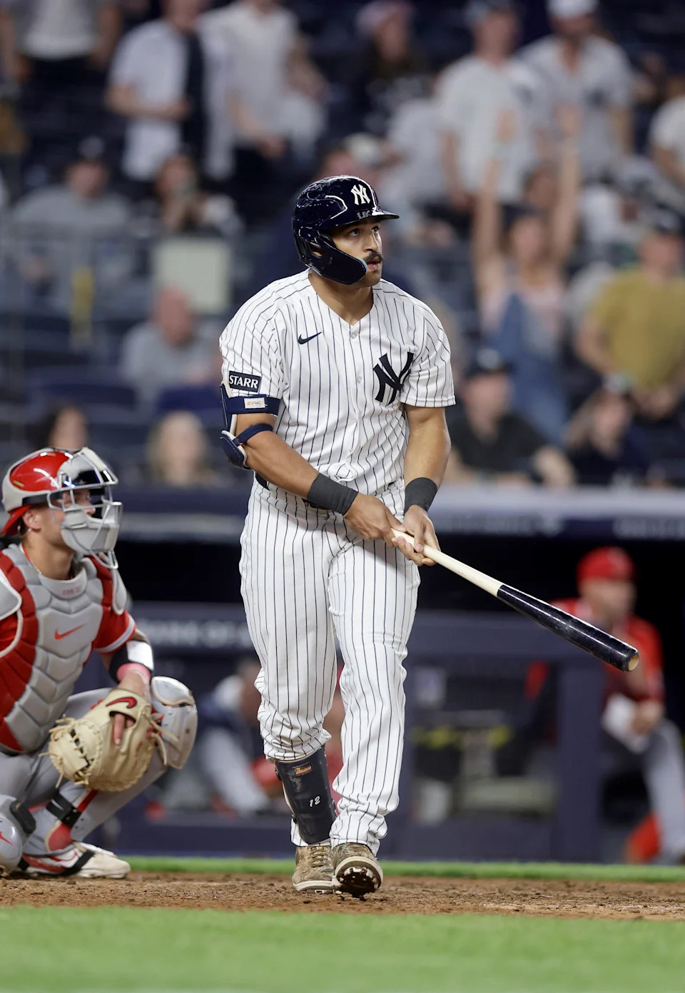 NEW YORK, NEW YORK – APRIL 13: Trent Grisham #12 of the New York Yankees watches his game-tying, two-run home run in the ninth inning against the Los Angeles Angels at Yankee Stadium on April 13, 2026 in New York City. (Photo by Jim McIsaac/Getty Images)
