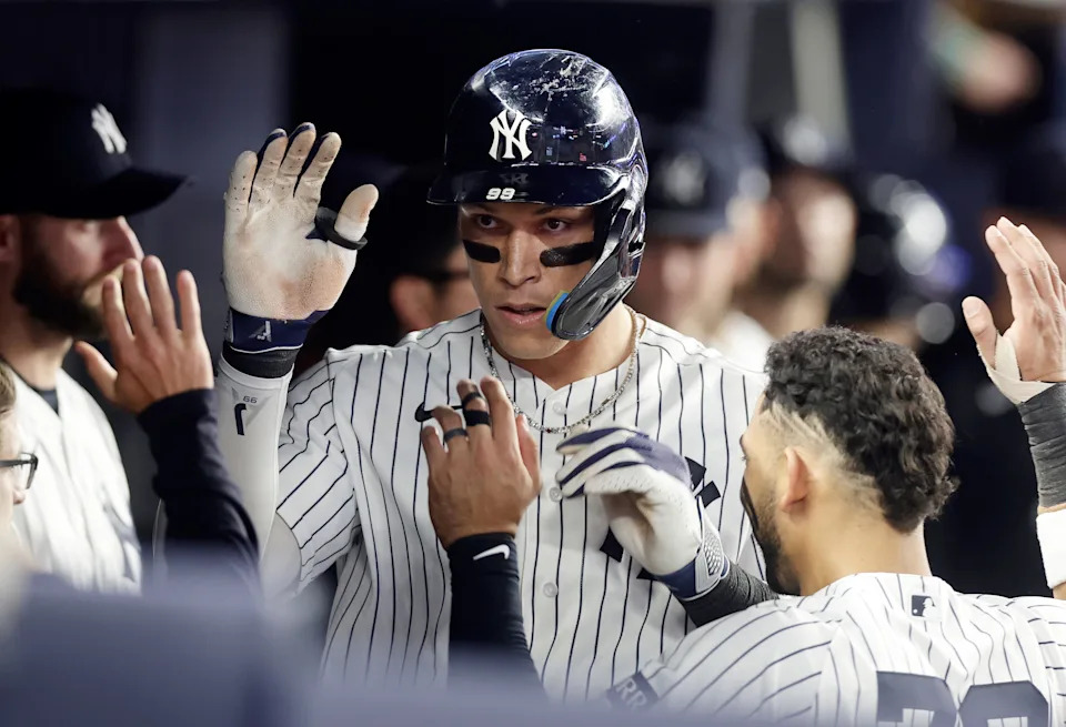NEW YORK, NEW YORK – APRIL 13: Aaron Judge #99 of the New York Yankees celebrates in the dugout his solo home run in the sixth inning against the Los Angeles Angels at Yankee Stadium on April 13, 2026 in New York City. (Photo by Jim McIsaac/Getty Images)