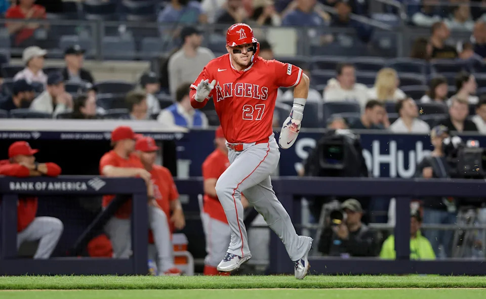 NEW YORK, NEW YORK – APRIL 13: Mike Trout #27 of the Los Angeles Angels scores a run during the fourth inning against the New York Yankees at Yankee Stadium on April 13, 2026 in New York City. (Photo by Jim McIsaac/Getty Images)