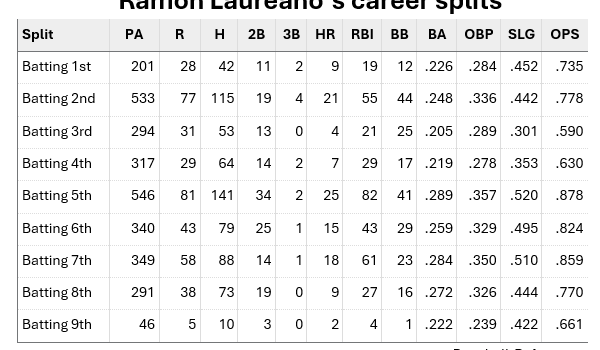 While he has especially thrived in the bottom half of the lineup, Laureano’s career numbers support his contention that where he hits does not matter to him. He has between 200 and 546 plate appearances at every spot in the order except ninth and has an OPS of .735 or higher at six of those spots.