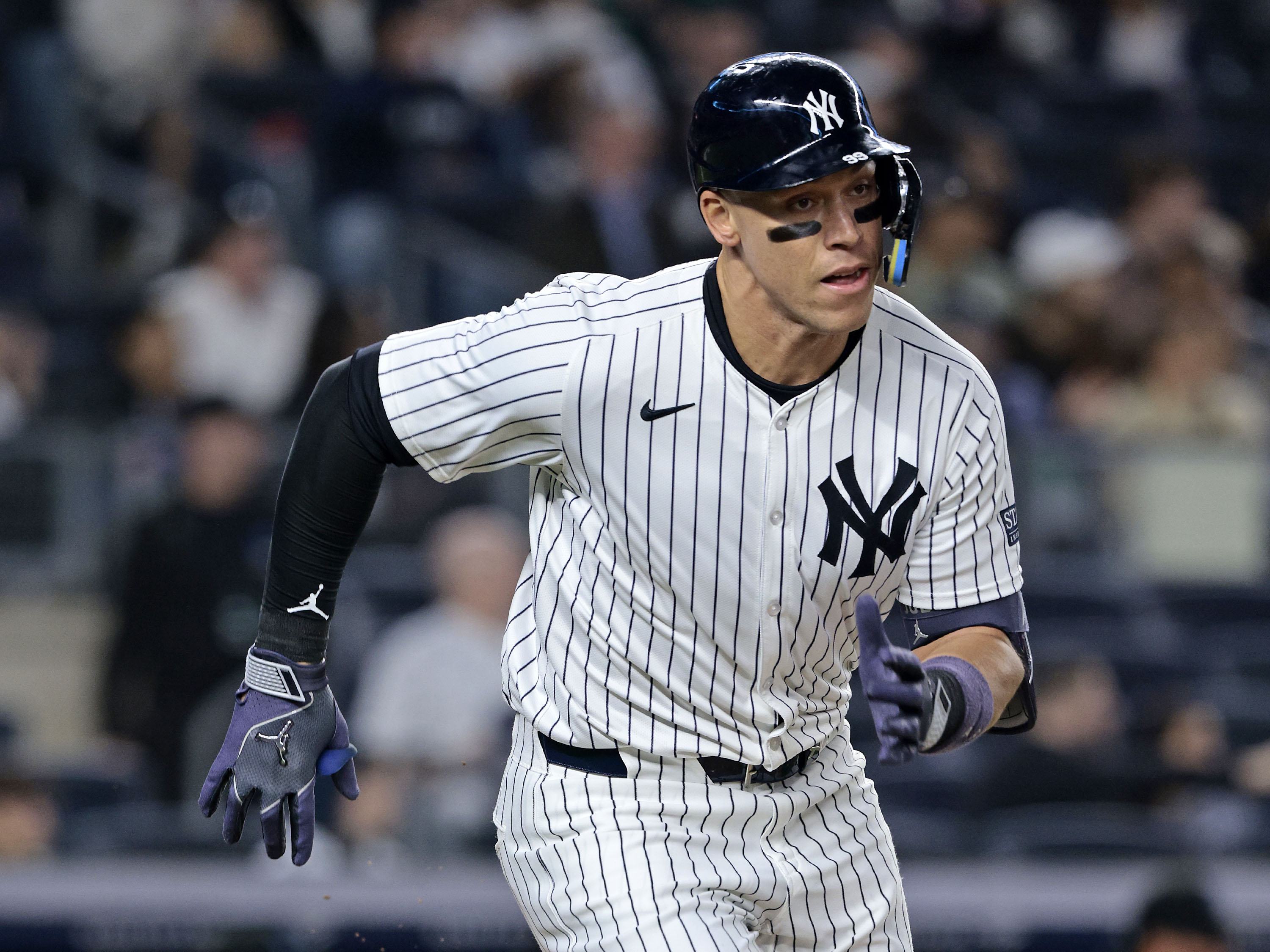 GettyAaron Judge #99 of the New York Yankees runs up the first base line after hitting a double in the bottom of the third inning against the Miami Marlins at Yankee Stadium on April 9, 2024 in New York City.
