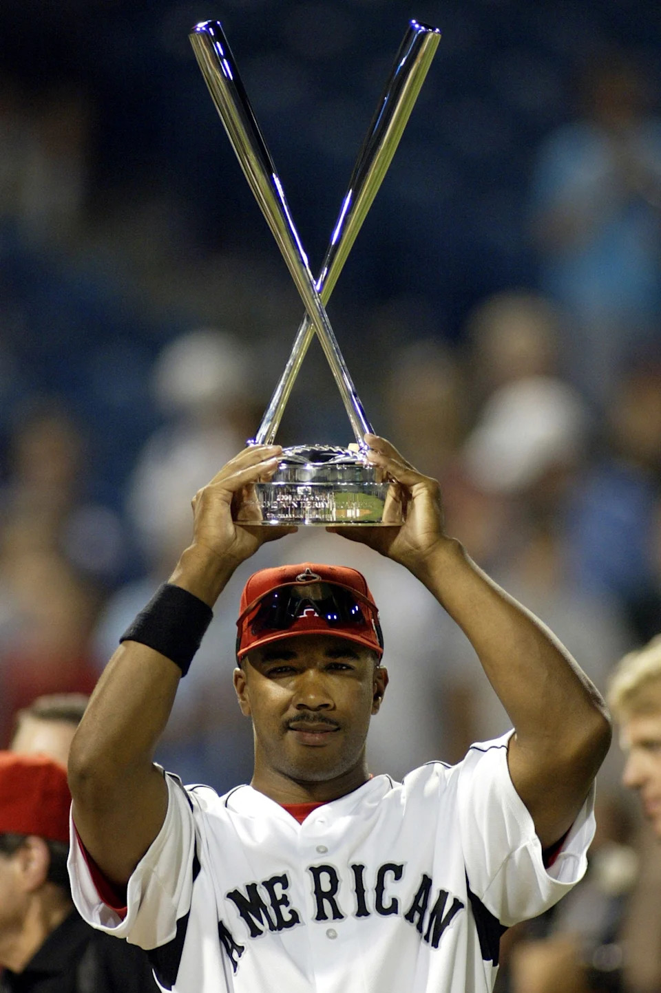 All-Star game MVP Garret Anderson (L) of the Anaheim Angels holds the trophy on July 15, 2003 after the 74th mid-summer classic at US Cellular Field, in Chicago. The American League beat the National League 7-6 to win the game.