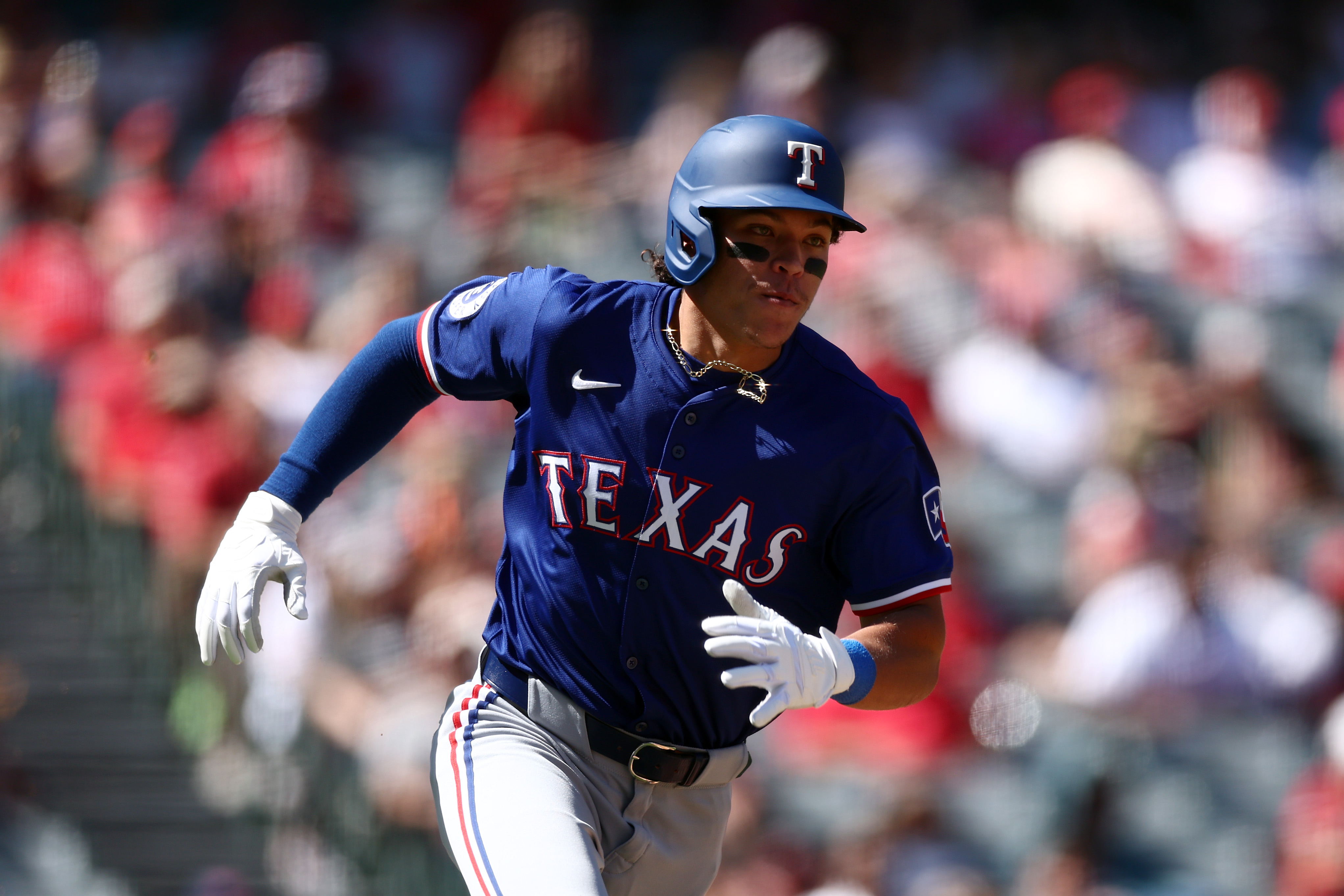 ANAHEIM, CALIFORNIA – SEPTEMBER 28: Dustin Harris #38 of the Texas Rangers jogs to first base after being walked in his MLB debut during the second inning against the Los Angeles Angels at Angel Stadium of Anaheim on September 28, 2024 in Anaheim, California. (Photo by Katelyn Mulcahy/Getty Images)