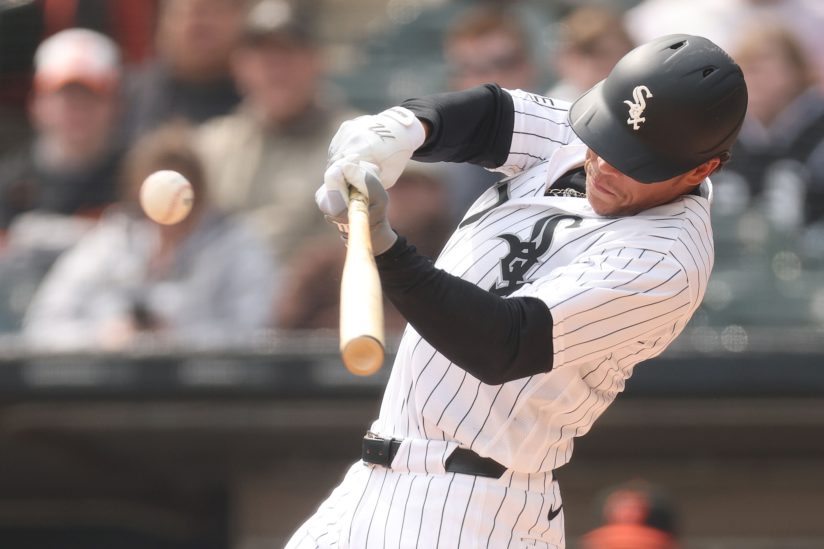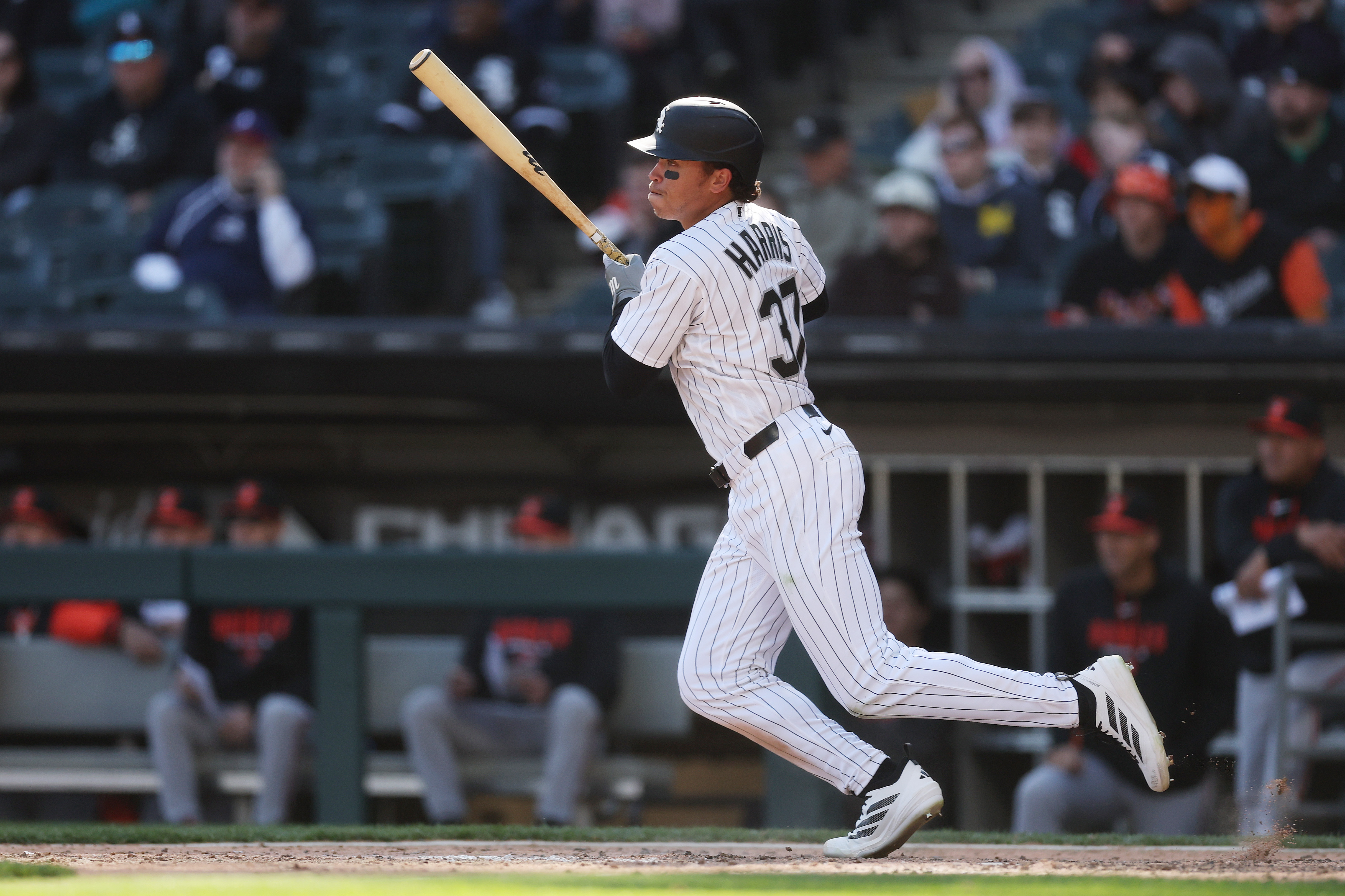 GettyDustin Harris #37 of the Chicago White Sox hits a RBI single during the first inning against the Baltimore Orioles at Rate Field on April 08, 2026 in Chicago, Illinois.