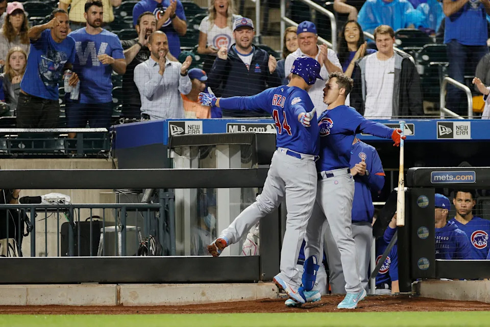 Anthony Rizzo chest-bumps teammate Joc Pederson of the Chicago Cubs after hitting a solo home run during the seventh inning against the New York Mets at Citi Field on June 14, 2021, in New York.