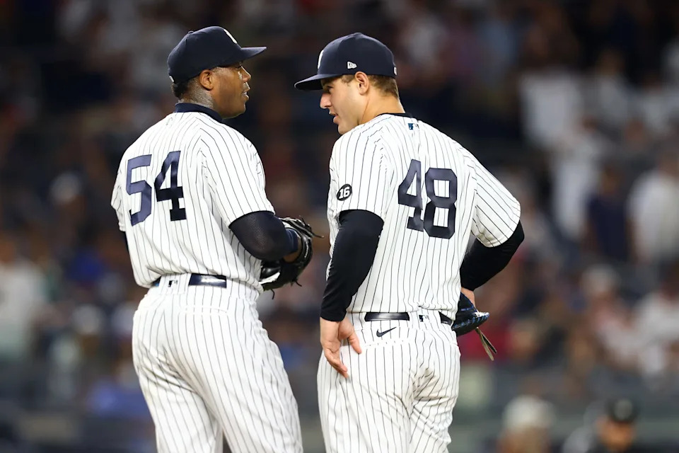 Anthony Rizzo and Aroldis Chapman of the New York Yankees look on during the ninth inning against the Boston Red Sox at Yankee Stadium on Aug. 18, 2021, in New York.
