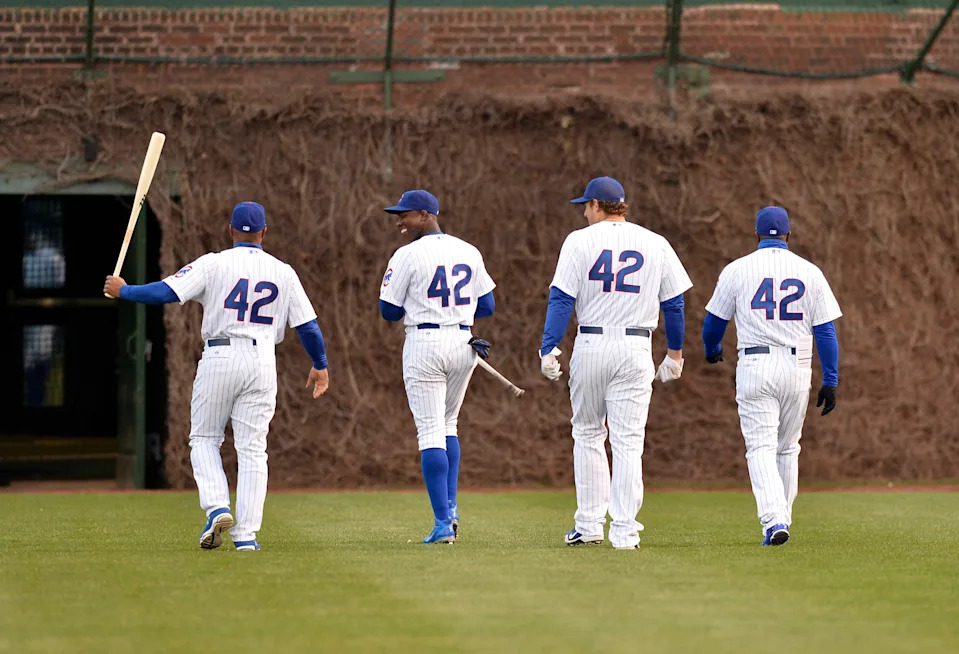 From left to right: Alberto Gonzalez, Alfonso Soriano, Anthony Rizzo and bullpen coach Lester Strode of the Chicago Cubs — each wearing No. 42 to commemorate Jackie Robinson Day — head to the batting cage before playing Texas Rangers at Wrigley Field on April 16, 2013.