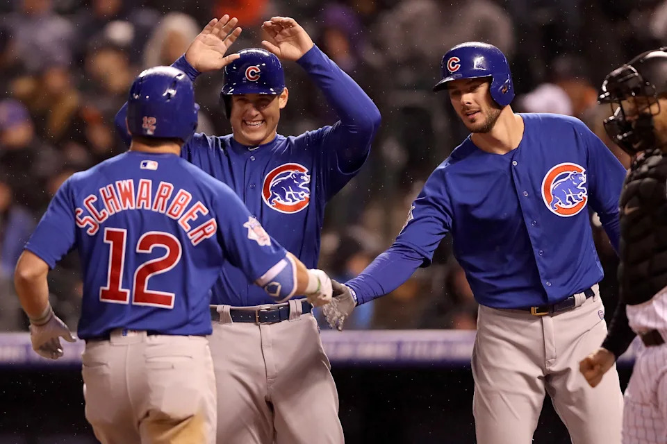 Kyle Schwarber of the Chicago Cubs is congratulated at the plate by Anthony Rizzo and Kris Bryant after hitting a three-run home run in the sixth inning against the Colorado Rockies at Coors Field on April 20, 2018, in Denver.