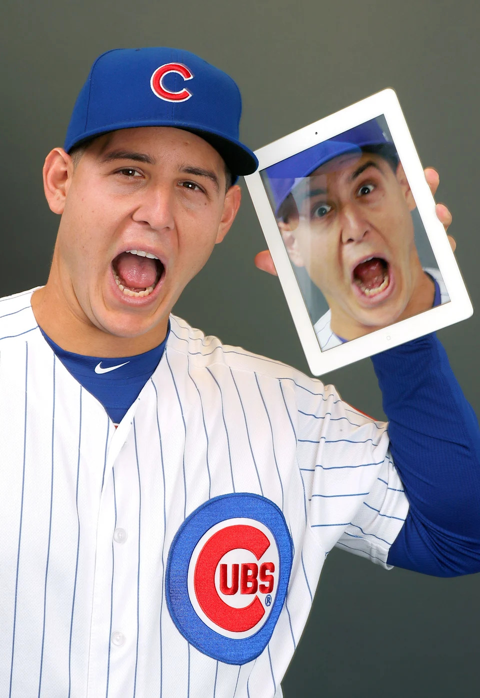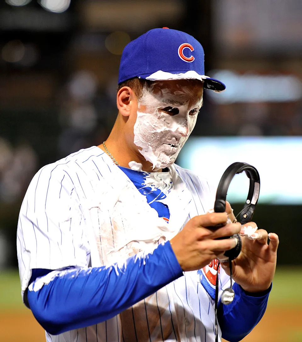 Anthony Rizzo of the Chicago Cubs puts his headset back on after teammate Matt Garza covered his face with shaving cream while Rizzo was being interviewed after the game against the New York Mets at Wrigley Field on June 26, 2012, in Chicago.