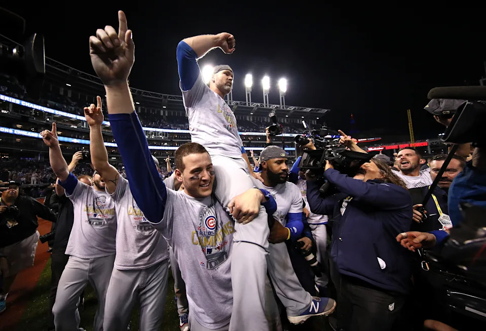 Anthony Rizzo and the Chicago Cubs celebrate after winning 8-7 against the Cleveland Indians in Game 7 of the 2016 World Series at Progressive Field on Nov. 2, 2016, in Cleveland. The Cubs won their first World Series in 108 years.