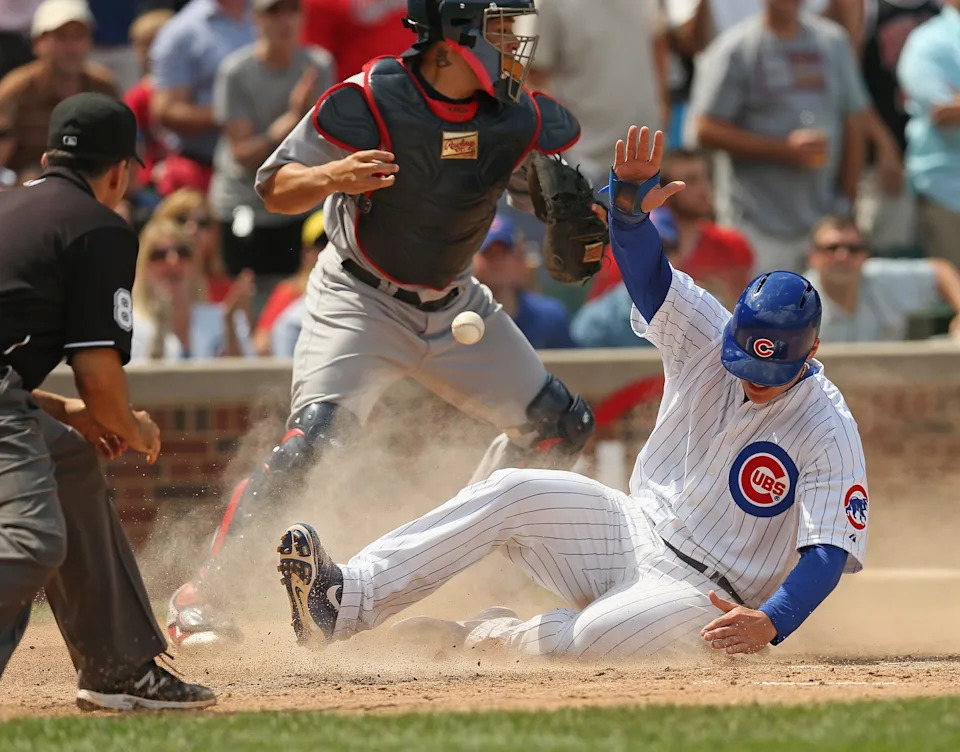 Anthony Rizzo of the Chicago Cubs slides safely into home plate as Yadier Molina of the St. Louis Cardinals drops the ball at Wrigley Field on July 27, 2012, in Chicago.