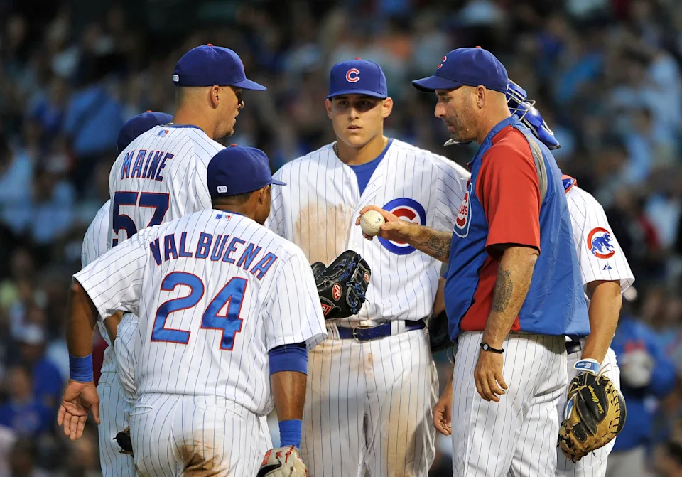 Chicago Cubs manager Dale Sveum hands the ball to relief pitcher Scott Maine as they stand on the mound with Luis Valbuena and Anthony Rizzo after Sveum took out starter Randy Wells during the fourth inning against the New York Mets at Wrigley Field on June 26, 2012.