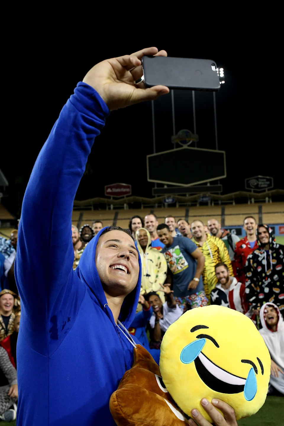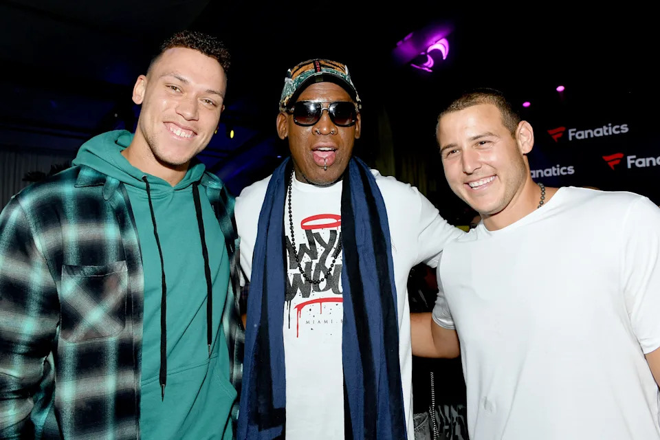 Aaron Judge, Dennis Rodman and Anthony Rizzo attend Michael Rubin’s Fanatics Super Bowl party at Loews Miami Beach Hotel on Feb. 1, 2020, in Miami Beach, Florida.
