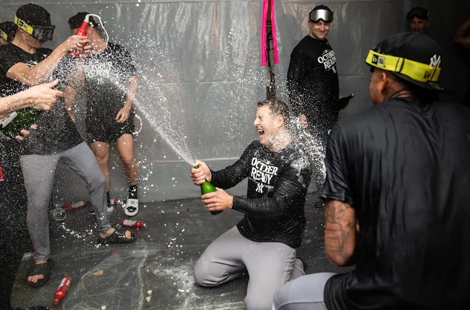 Anthony Rizzo of the New Yankees celebrates clinching a playoff spot with teammates in the clubhouse after a game against the Seattle Mariners at T-Mobile Park on Sept. 18, 2024, in Seattle.