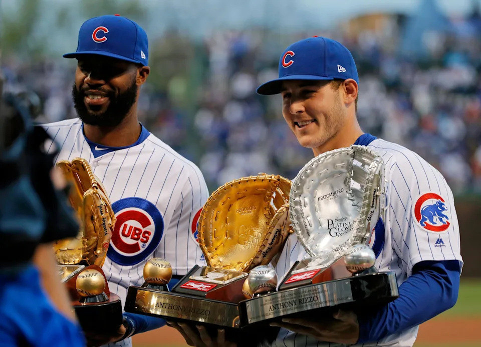 Anthony Rizzo of the Chicago Cubs poses with his Golden Glove and Platinum Glove next to Jason Heyward and his Golden Glove before the game against the Milwaukee Brewers at Wrigley Field on April 18, 2017, in Chicago.