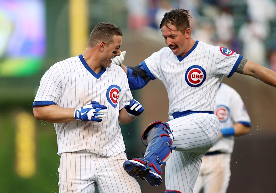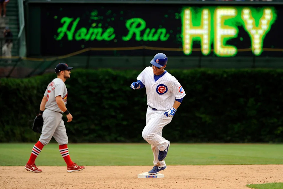 Chicago Cubs first baseman Anthony Rizzo hits a walk-off two-run home run in the 10th inning to defeat the St. Louis Cardinals at Wrigley Field on July 29, 2012.