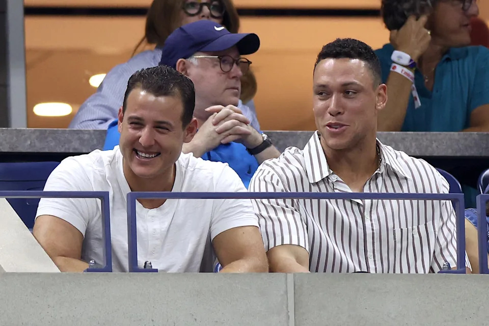 New York Yankees players Anthony Rizzo and Aaron Judge look on during the women’s singles second round match between Naomi Osaka and Karolina Muchova on Day 4 of the 2024 US Open at USTA Billie Jean King National Tennis Center in New York on Aug. 29, 2024.