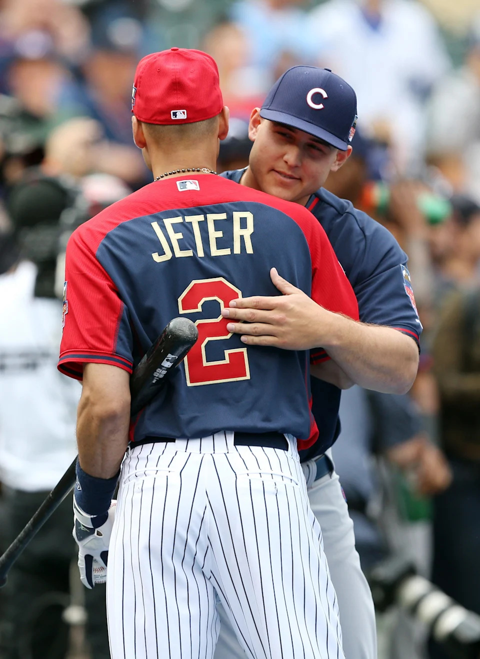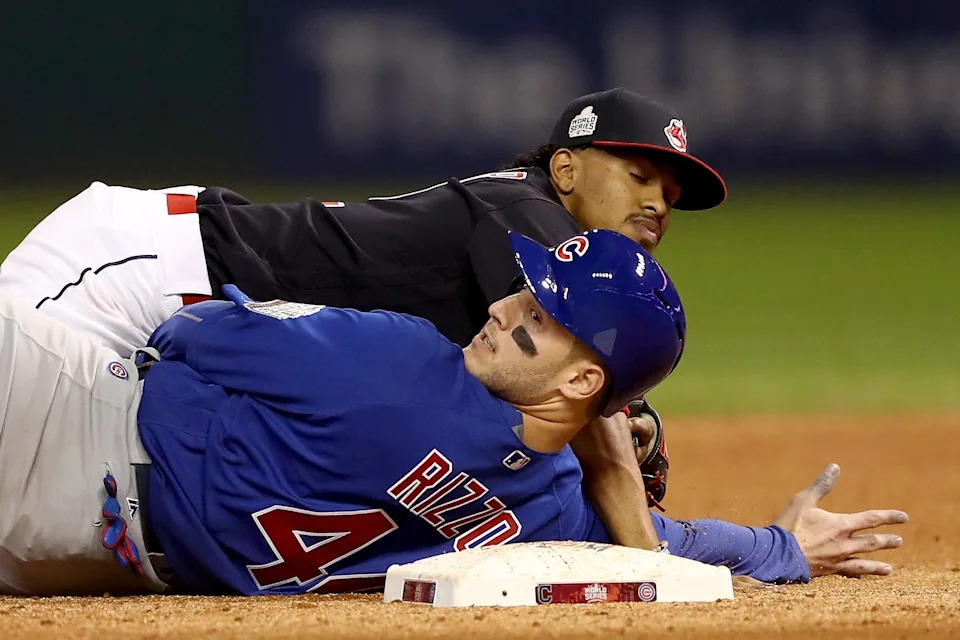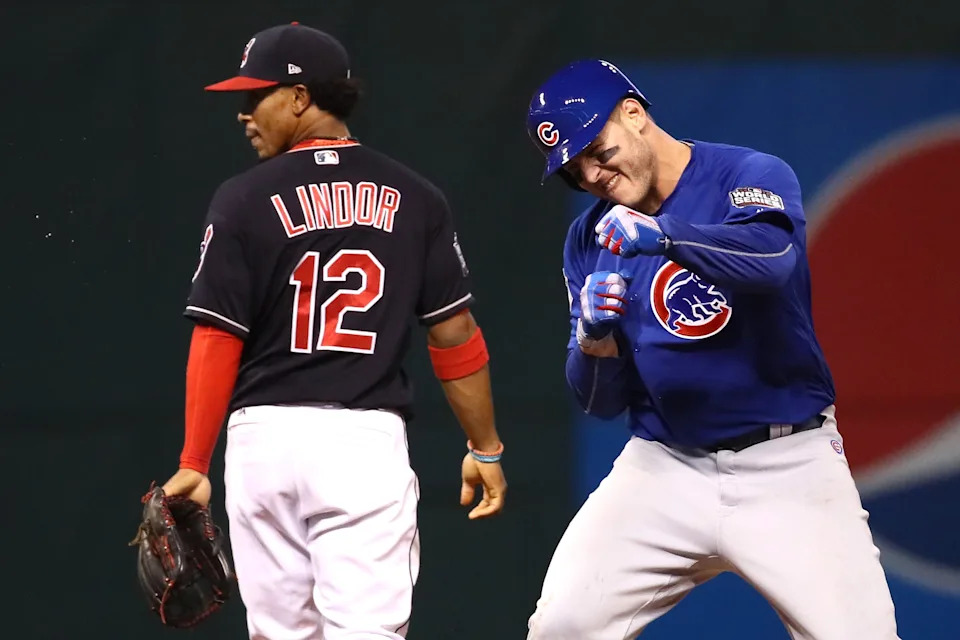 Anthony Rizzo of the Chicago Cubs reacts next to Cleveland Indians shortstop Francisco Lindor after hitting an RBI single to score Kris Bryant during the fifth inning in Game 7 of the 2016 World Series at Progressive Field on Nov. 2, 2016, in Cleveland.