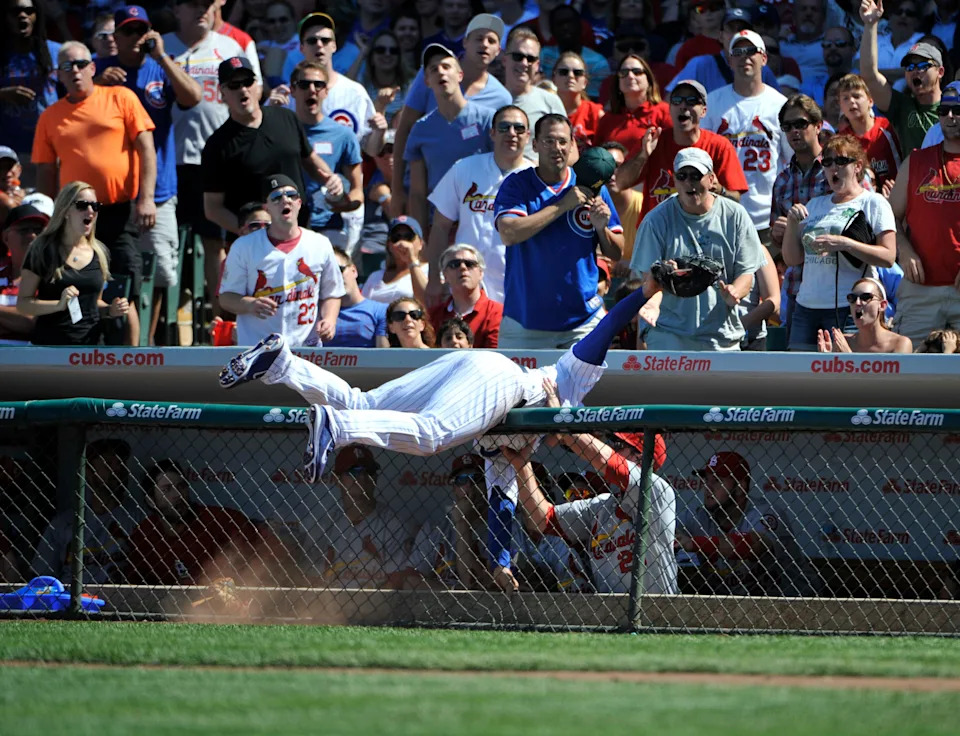 Anthony Rizzo of the Chicago Cubs makes a catch on Yadier Molina of the St. Louis Cardinals during the fifth inning on August 18, 2013, at Wrigley Field in Chicago.