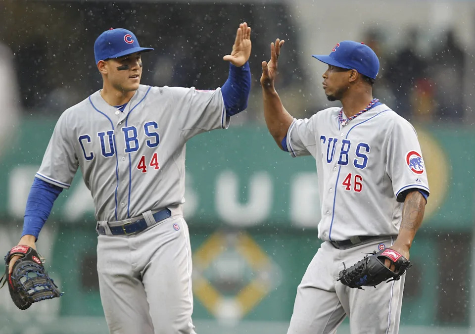 Chicago Cubs first baseman Anthony Rizzo and relief pitcher Pedro Strop celebrate after defeating the Pittsburgh Pirates at PNC Park on April 3, 2014. The Cubs won 3-2.