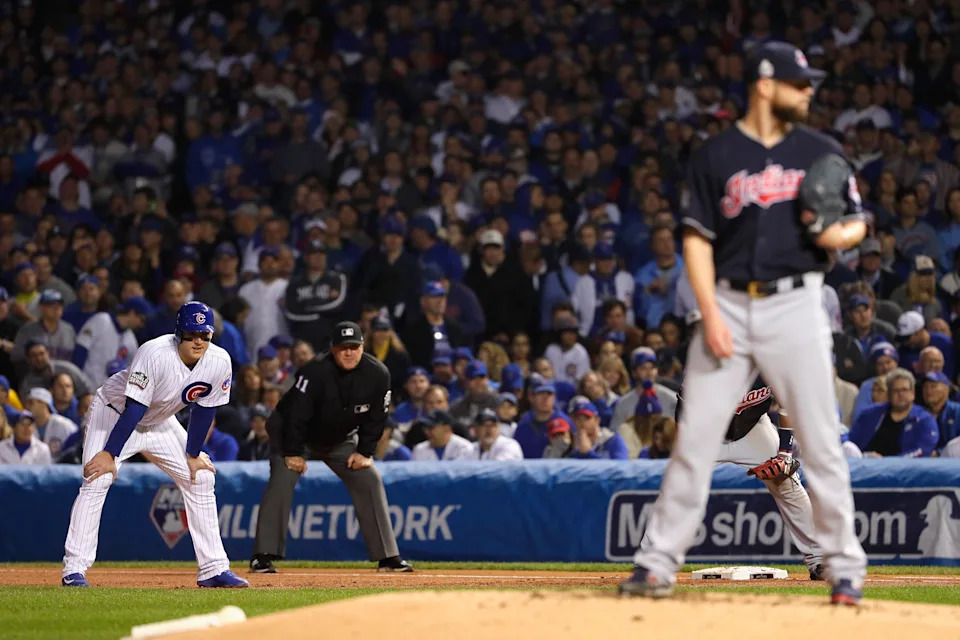 Anthony Rizzo of the Chicago Cubs leads off first base as Corey Kluber of the Cleveland Indians pitches in the first inning in Game 4 of the 2016 World Series at Wrigley Field on Oct. 29, 2016, in Chicago.