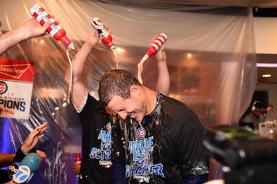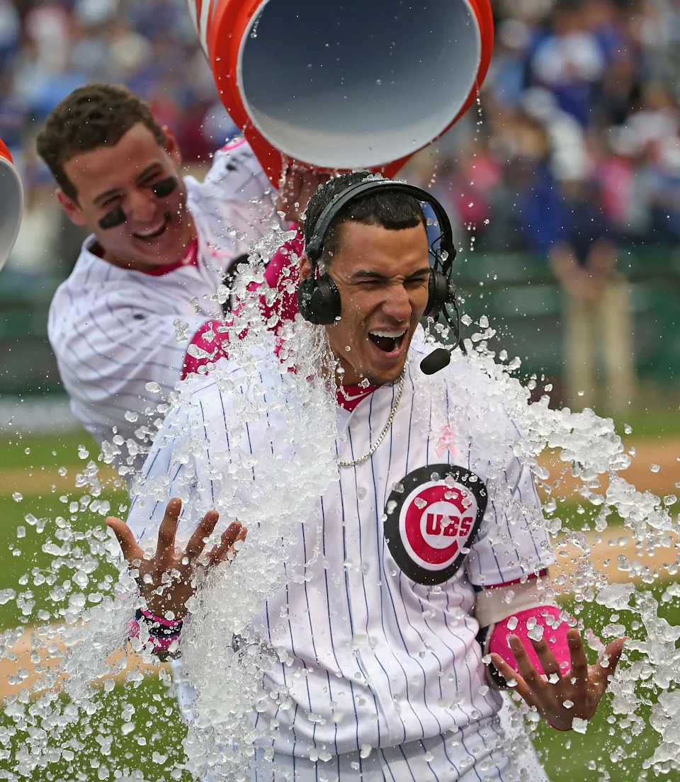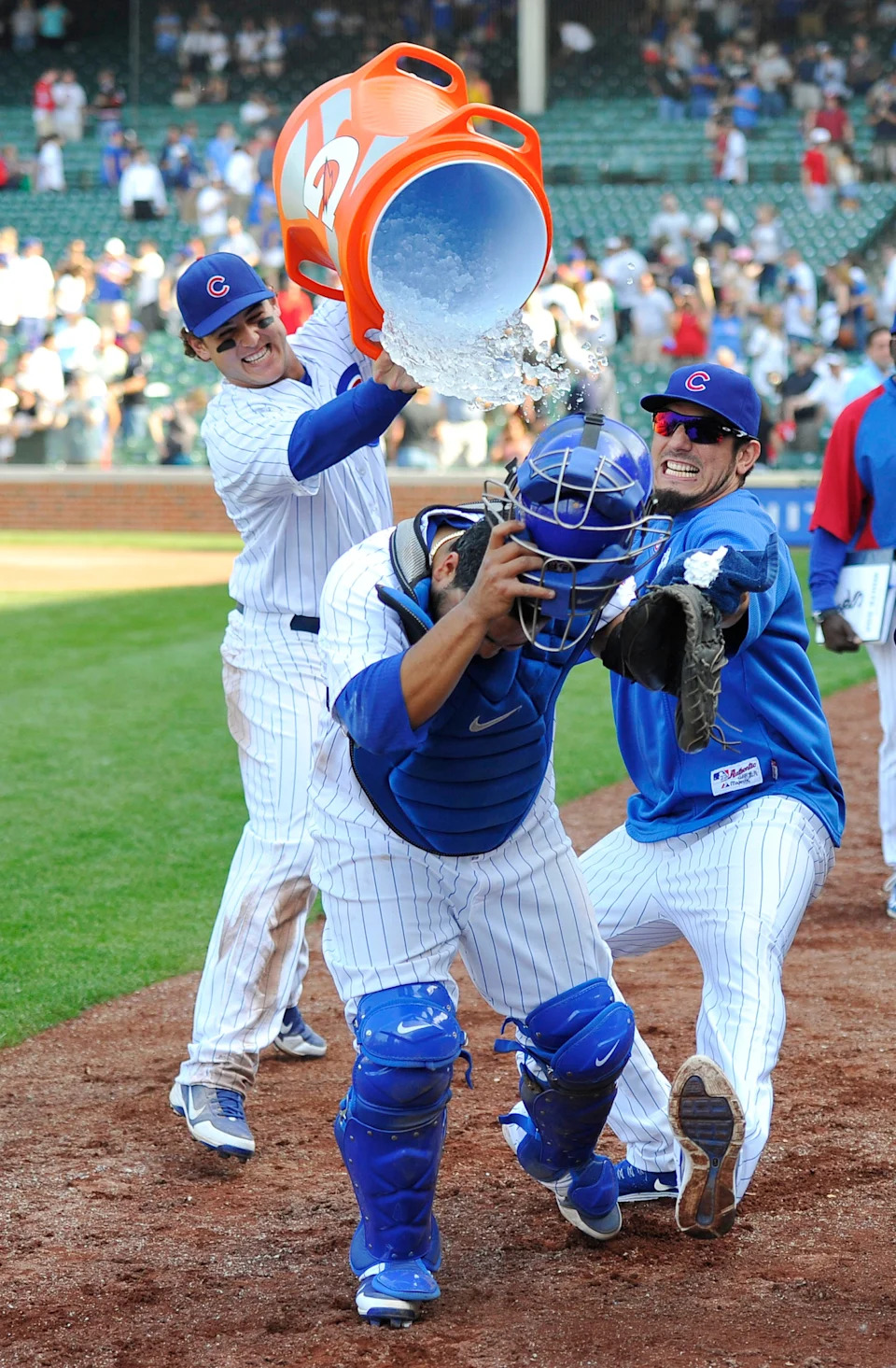 Anthony Rizzo and Matt Garza attack Chicago Cubs teammate Dioner Navarro with water and shaving cream after the game against the Chicago White Sox at Wrigley Field on May 29, 2013. Navarro hit three home runs in the game as the Cubs defeated the White Sox 9-3.