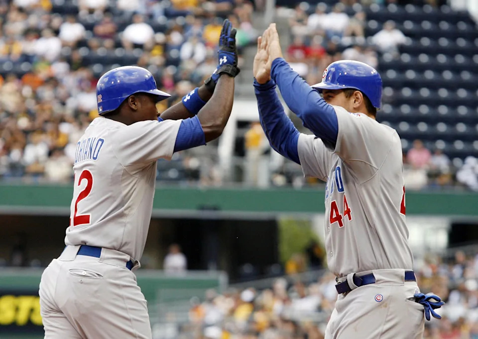Chicago Cubs left fielder Alfonso Soriano and Cubs first baseman Anthony Rizzo celebrate at home plate after Soriano hit a two-run home run against the Pittsburgh Pirates during the eighth inning at PNC Park on Sept. 9, 2012.