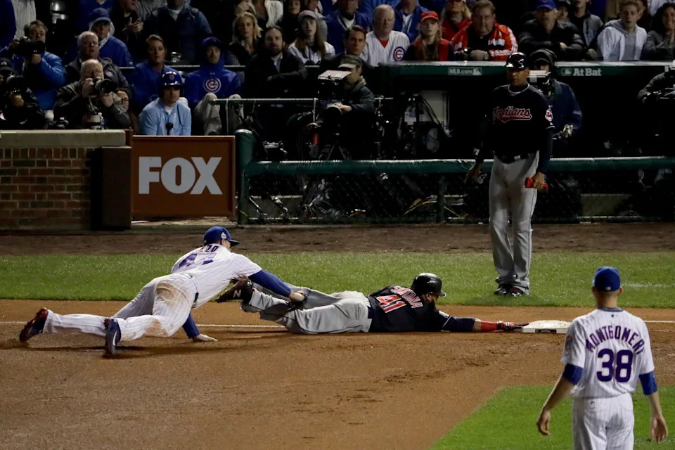 Carlos Santana of the Cleveland Indians dives back into first base to avoid a tag attempt by Anthony Rizzo of the Chicago Cubs in the sixth inning in Game 4 of the 2016 World Series at Wrigley Field on Oct. 29, 2016, in Chicago.